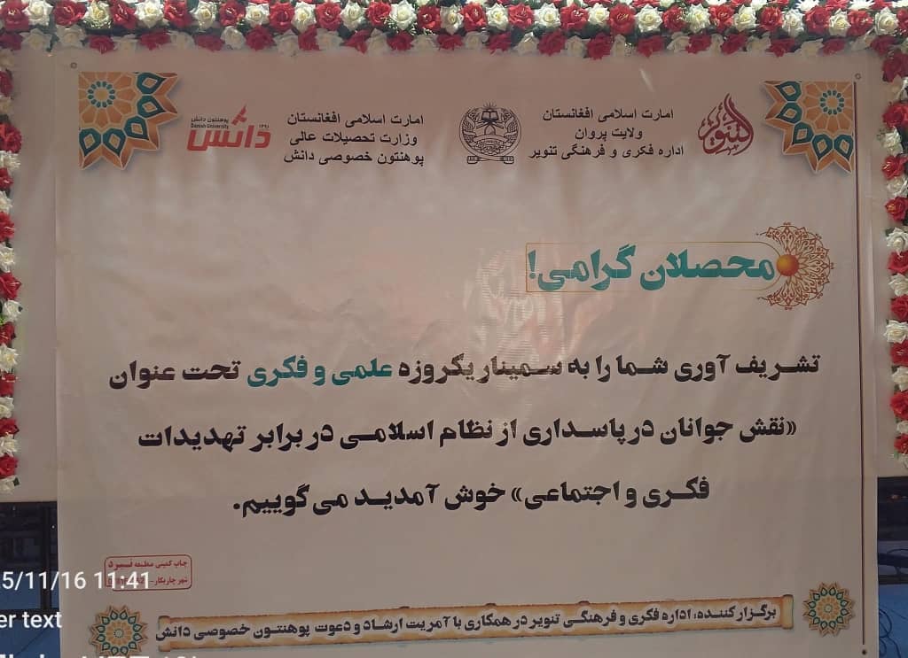 سمینار علمی و فکری با عنوان «نقش جوانان در پاسداری از نظام اسلامی در برابر تهدیدات فکری و اجتماعی» در پوهنتون دانش برگزار شد.