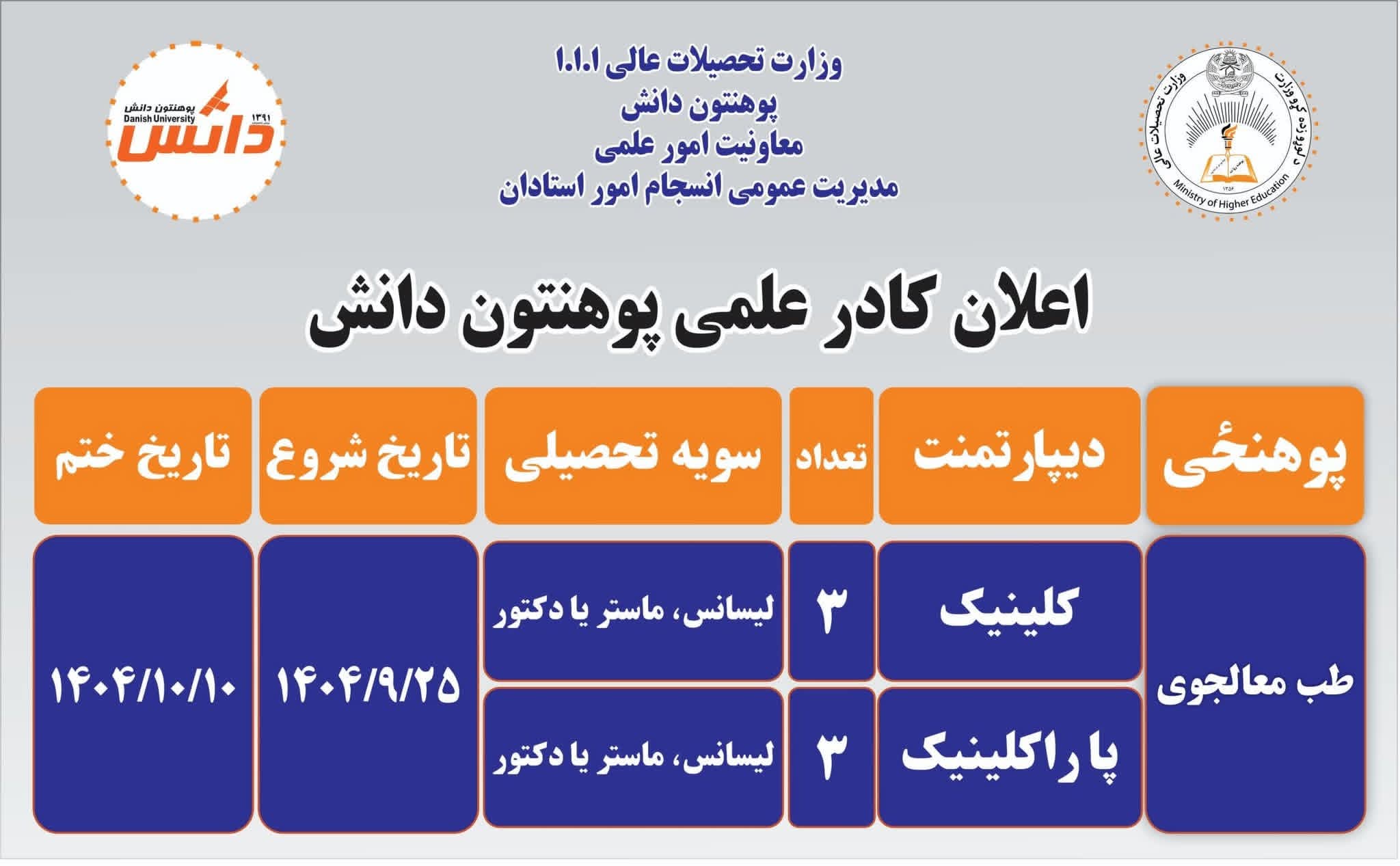 وزارت تحصیلات عالی به منظور تعیین استادان دایمی در پوهنتونهای خصوصی، (۷۵۹) بست خالی کادری را به اعلان میسپارد.